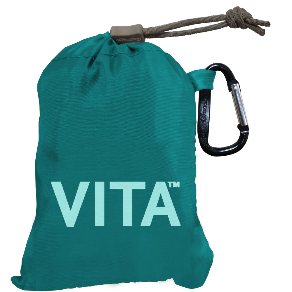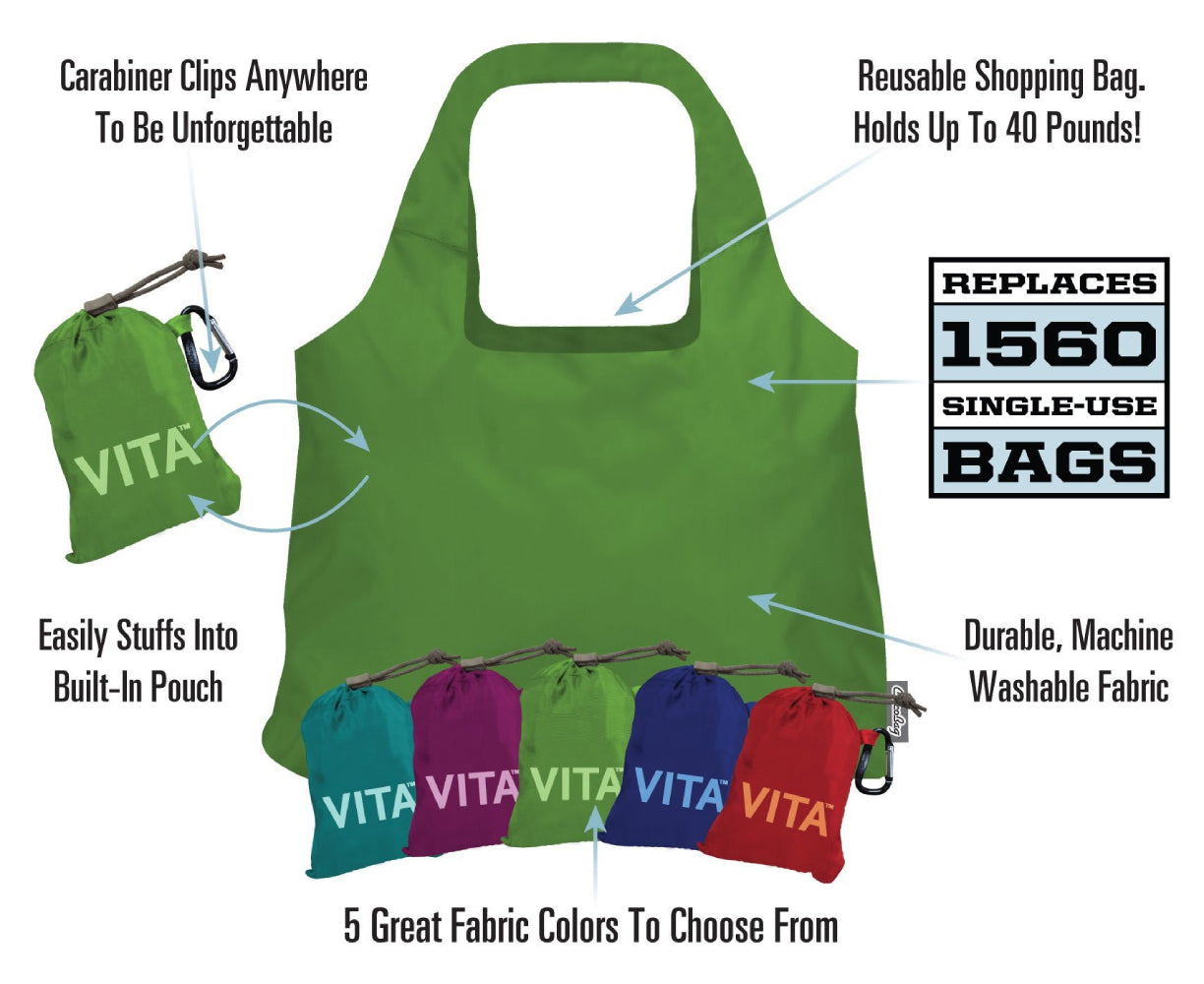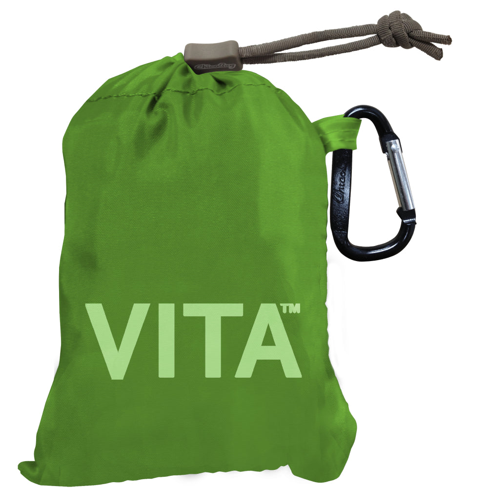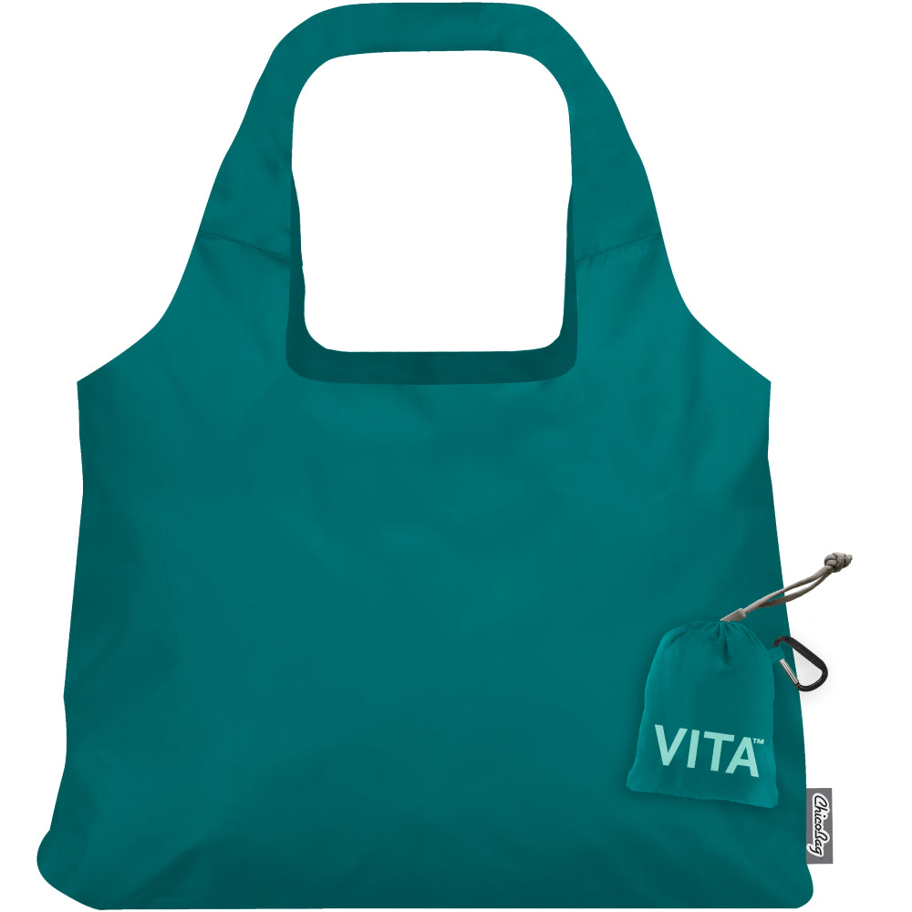 The ChicoBag Vita Polyester Shoulder Tote replaces 1560 Single-Use Bags throughout its life. This large capacity shoulder tote features a 40-pound carrying capacity and when not in use, the entire bag stuffs into its built-in pouch for convenient storage. The Vita is perfect for trips to the market, bookstore, or beach.